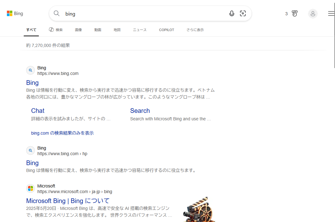 Microsoftが提供している検索エンジンです。Bingは独自の検索技術を使っており、Googleでの検索とは違う結果が出てきます。